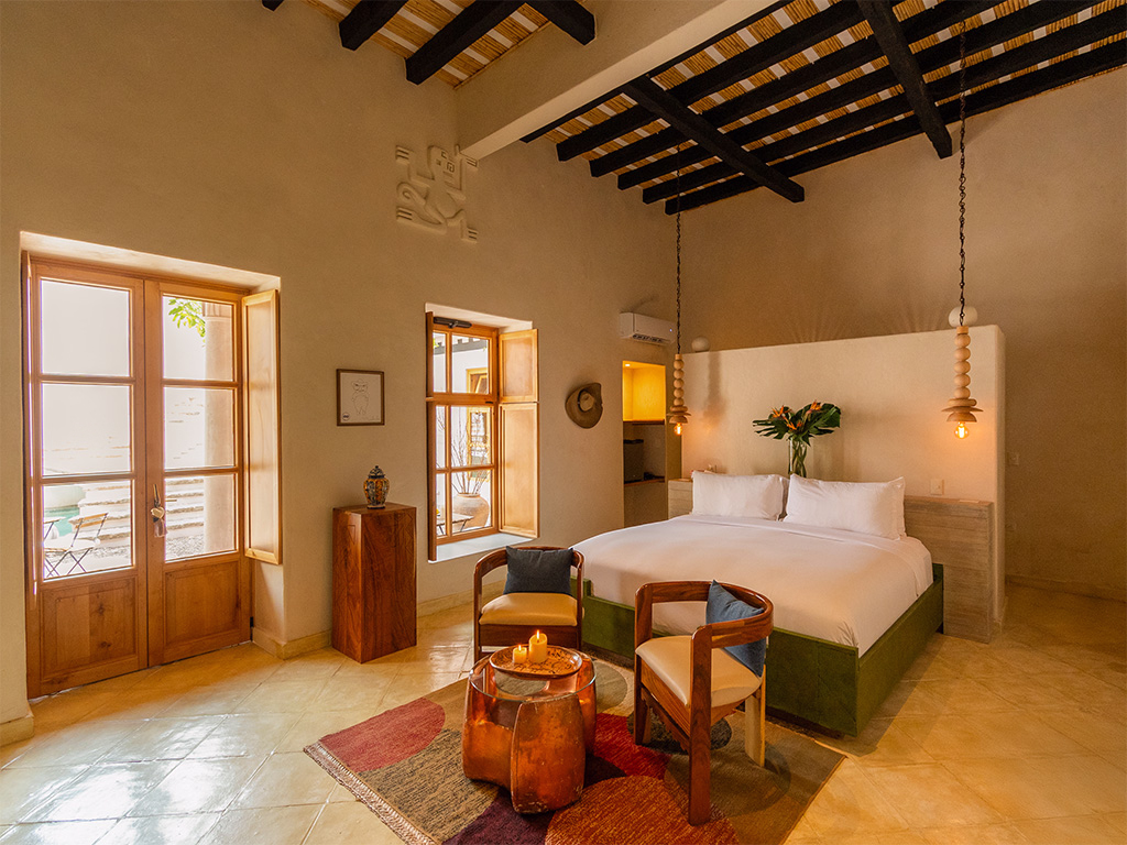 Ornately designed suite with direct views of the inner courtyard and gardens through floor-to-ceiling windows. Decorated with Aztec monkey symbols by Pedro Friedberg representing creativity joy and cultural richness.