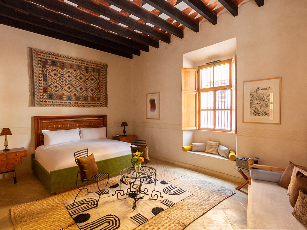 Located on the ground floor with direct access to the zen interior gardens this breathtaking suite features high wood-beamed ceilings soothing stucco tones and soft textiles. The highlight is an antique soaking tub positioned in front of a warm fireplace ideal for San Miguel’s cool evenings.