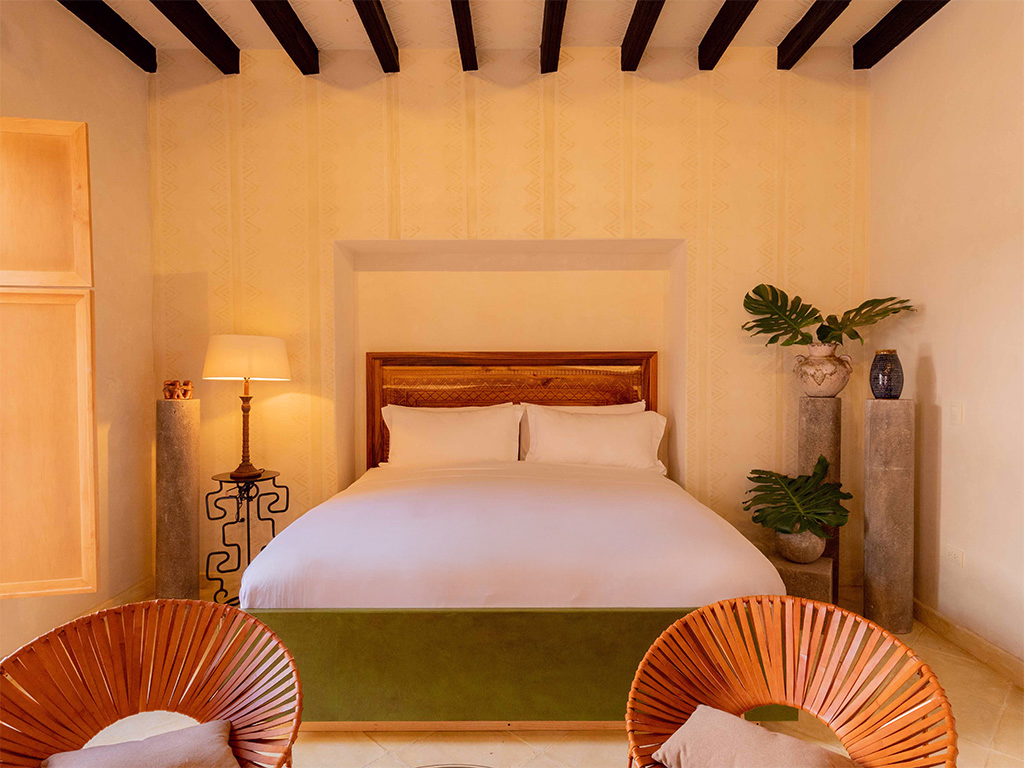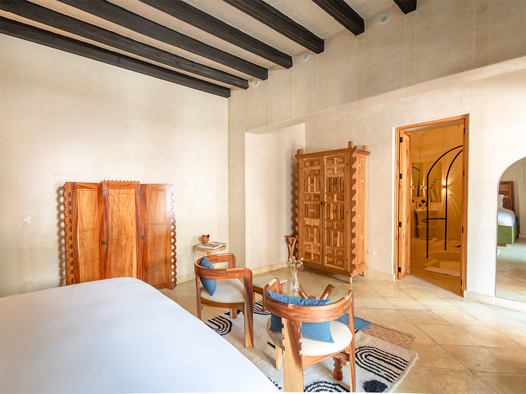 Inspired by the Aztec concept of Nahui Ollin symbolizing movement and life force. Features a spa-inspired Roman soaking tub enclosed by a custom metal sculpture blending artisanal craftsmanship with mid-century furniture.